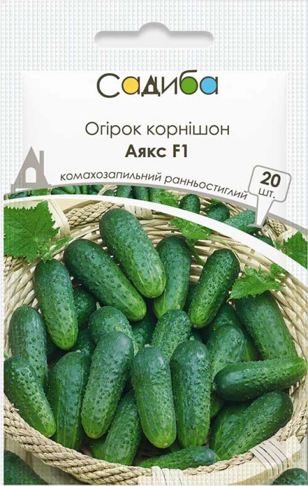 Огірок Аякс F1 – ранньостиглий (40-50 днів) комахозапильний гібрид корнішонного типу з високою стабільною врожайністю для вирощування у відкритому ґрунті. Відкрита потужна плетиста рослина формує декілька огірочків в одному вузлі. Зеленці однорідні, темно-зеленого кольору, білошипі, довжиною 6-12 см, соковиті, генетично без гіркоти. Середня врожайність 5-10 кг/м2. Гібрид отримав визнання за відмінні смакові й засолювальні якості, високу стійкість до спеки, посухи й поширених хвороб. Спеціально виведений для вирощування на пікулі.