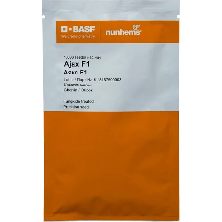 Огірок Аякс F1 – ранньостиглий (40-50 днів) комахозапильний гібрид корнішонного типу з високою стабільною врожайністю для вирощування у відкритому ґрунті. Відкрита потужна плетиста рослина формує декілька огірочків в одному вузлі. Зеленці однорідні, темно-зеленого кольору, білошипі, довжиною 6-12 см, соковиті, генетично без гіркоти. Середня врожайність 5-10 кг/м2. Гібрид отримав визнання за відмінні смакові й засолювальні якості, високу стійкість до спеки, посухи й поширених хвороб. Спеціально виведений для вирощування на пікулі.