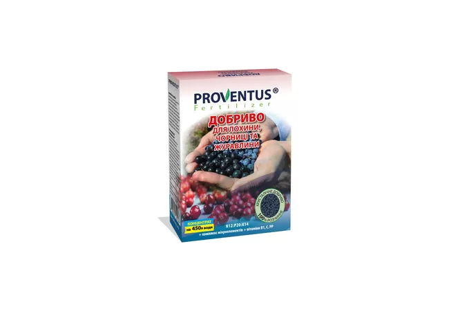 Добриво Провентус з NPK 12:20:14 спеціально створено для фруктових і ягідних кущів, таких як малина, смородина, аґрус, айва, шипшина, лохина, чорниця, клюква. Даний препарат це якісне, концентроване, мінеральне добриво, містить усі необхідні елементи для харчування рослин у доступних формах. Добриво забезпечує здорове харчування для рослин і може використовуватись у будь-якій системі полива, у тому числі крапельне зрошення, вологість, гідропоніка та інші рослини. Так само препарат усуває наслідки від впливу гербіцидів та несприятливих погодних умов, збільшує стійкість рослин до хвороб і внаслідок цього в 1,5 – 2 рази збільшується врожай. Переваги добрива : – Екологічно чистий і безпечний для навколишнього середовища. – Збільшує врожайність, цукристість, розмір плодів і ягід, пришвидшує дозрівання. – — — – Зменшує кількість опалих плодів та ягід. – Сумісний з пестицидами, добривами і стимуляторами. – Покращує смакові якості плодів і ягід, підвищує в них вміст корисних речовин (вітамінів, фруктози, пектину та ін.) – Забезпечує рослину повноцінним харчуванням, компенсує дефіцит макро- і мікроелементів. Склад: азот (N) – 12%, фосфор (P) – 20%, калій (K) – 14%, сірка (S) – 150%, магній (Mg) – 25%, бор (B) – 0.31%, залізо (Fe) – 1.6%, марганець (Mn) – 0,34%, цинк (Zn) – 0,32%, мідь (Cu) – 0.23%, молібден (Mo) – 0.03%, кобальт – 0.02%, витамины В1, С, PP.