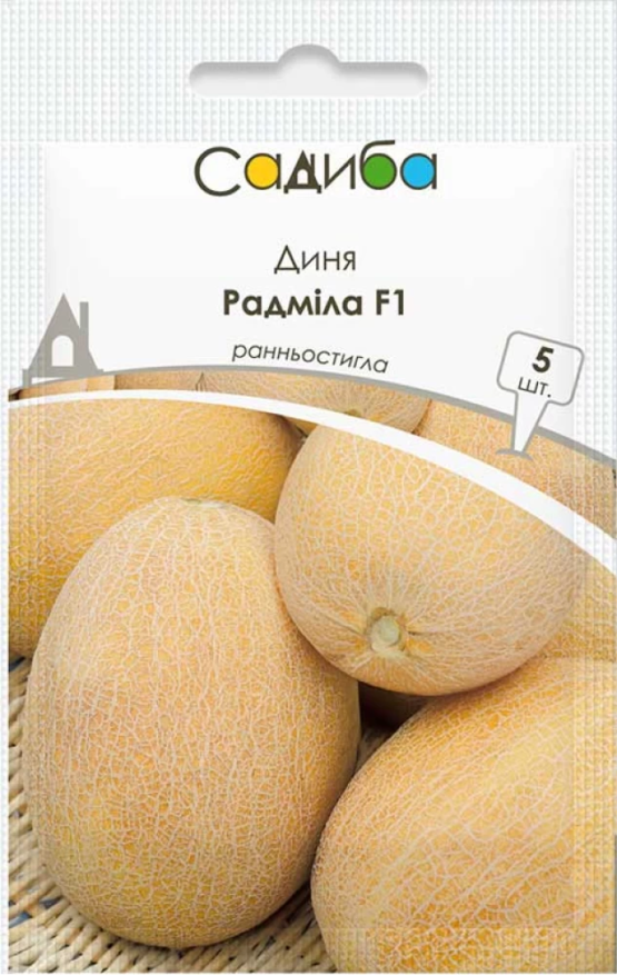 Диня Радміла F1 – ранньостиглий (60-65 днів від висадки розсади) високоврожайний гібрид сортотипу ананасної дині для вирощування у відкритому і закритому грунті. На потужній рослині формується 5-6 овальних диньок, надійно захищених від сонячних опіків рясним листям. Плоди однорідні, сітчасті, насиченого жовто-помаранчевого кольору, масою біля 2 кг, відносно лежкі, добре транспортуються. М’якуш солодкий, кремового забарвлення, щільної консистенції, дуже ароматний. В процесі зберігання не втрачає своєї якості. Призначається для реалізації на свіжому ринку, переробки та сушіння.