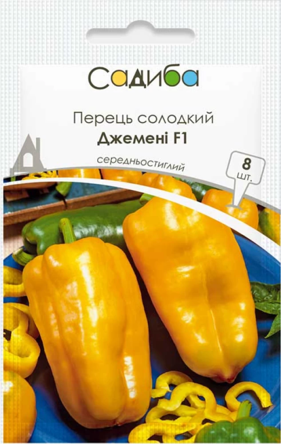 Перець Джемені F1 – середньостиглий (130-138 днів) гібрид для відкритого й закритого ґрунту. Рослина компактна, прямостояча, потужна, формує по 7-10 плодів. Перчини великі, кубовидно-видовжені, чотирикамерні, вагою 320-400 г, товщина стінки 6-8 мм. Плоди солодко-соковиті, в процесі дозрівання змінюють колір від темно-зеленого до яскраво-жовтого. Гібрид стійкий до вірусних хвороб, високих температур. Вживають свіжим, у кулінарних стравах, для консервації й заморозки.