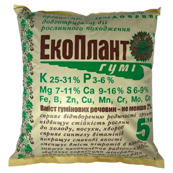 ЕкоПлант Гумі – це екологічно чисте органо-мінеральне добриво рослинного походження без хлору, яке сприяє відновленню родючості ґрунту на тривалий період.