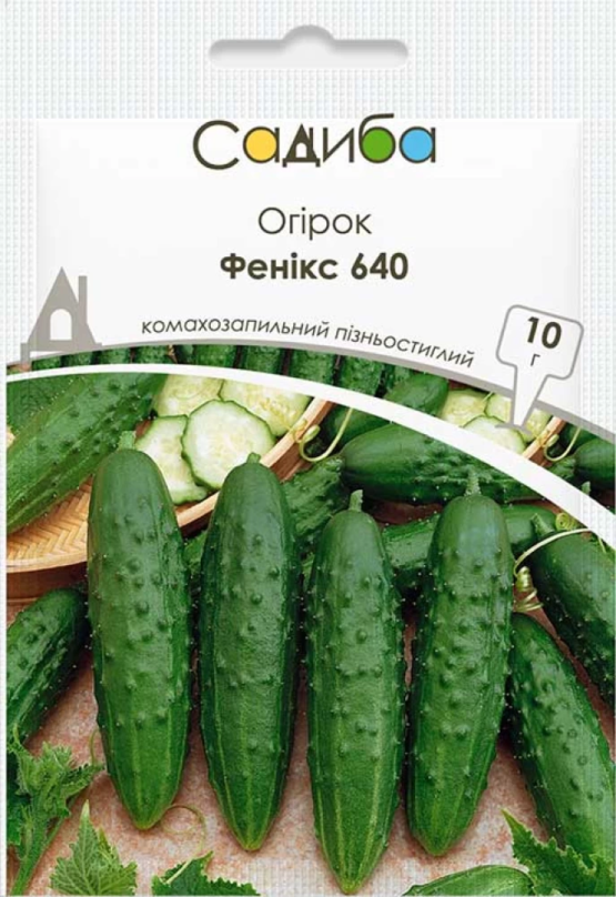 Огірок Фенікс 640 – пізньостиглий (більше 60 днів) комахозапильний сорт, призначений для вирощування переважно у відкритому ґрунті. Рослина довгоплетиста (до 3 м), утворює плоди поступово, період плодоношення триває більше 2 місяців. Зеленці видовжені 15-18 см, вагою до 150-180 г, насичено-зелені, крупногорбкуваті, білошипі, хрумкі, без гіркоти. Рекомендований для споживання в свіжому вигляді, але добре консервується й засолюється. Потенційна врожайність 5 кг/м² у відкритому ґрунті. Сорт несхильний до ураження пероноспорозом, стійкий до високих температур і до несприятливих погодних умов. Фенікс 640 улюбленець городників, які віддають перевагу витривалим і стійким сортам для відкритого ґрунту.