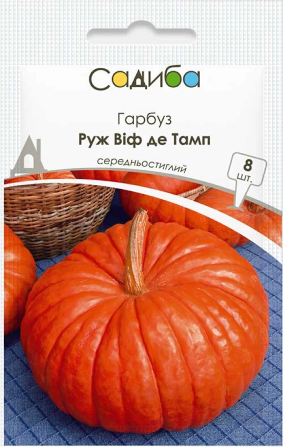 Гарбуз Руж Віф де Тамп – середньостиглий (110-115 днів) високоврожайний сорт великоплідного гарбуза з високим вмістом каротину. Плоди пласкуваті, насиченого помаранчево-червоного кольору, сегментовані, масою до 10-15 кг. М’якуш оранжевий, щільний, із прекрасними смаковими якостями. Сорт відзначається стійкістю до більшості хвороб і високою лежкістю. Гарбуз даного сорту здебільшого використовується для приготування соків і пюре, а також супів, запіканок. Гарно підходить для декору.