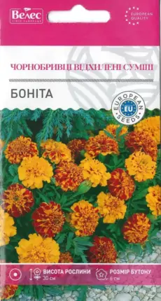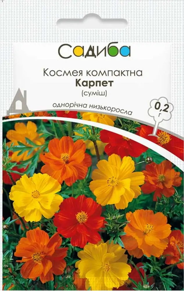 Космея компактна Карпет суміш – чарівна суміш однорічної квітучої рослини. Компактні, добре розгалужені кущики висотою 30 см. Блискучі напівмахрові квіти золотистого, лимонного, оранжевого й червоного забарвлення. Відмінно виглядає на бордюрах, у групових посадках у квітниках або в горщиках і контейнерах на терасі, рясно цвіте протягом літа до заморозків. Усі частини рослини їстівні, прикрашені квітками страви справлять незабутнє враження на гостей.
