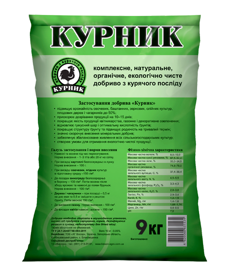 Курник® – органічне добриво на основі курячого посліду. Використовується на всіх ґрунтах і в будь-яких кліматичних зонах під усі види овочевих, ягідних та плодових культур. Ефективність застосування добрива є набагато вищою, ніж застосування компосту чи перегною. В процесі виробництва добрива відбувається процес фіксації азоту шляхом його перетворення на органічну форму. Це дозволяє рослинам засвоювати його і не відчувати шкоди для кореневої системи (звичайний свіжий курячий послід може обпалювати кореневі волоски). Технологія виробництва передбачає знезараження від шкідливих бактерій, яєць гельмінтів, насіння бур’янів. За вмістом азоту, фосфору і калію Курник® належить до органічних добрив і високим вмістом поживних елементів, що дає можливість значно скоротити внесення мінеральних добрив. Ця властивість робить його цінним при вирощуванні екологічно чистої продукції.