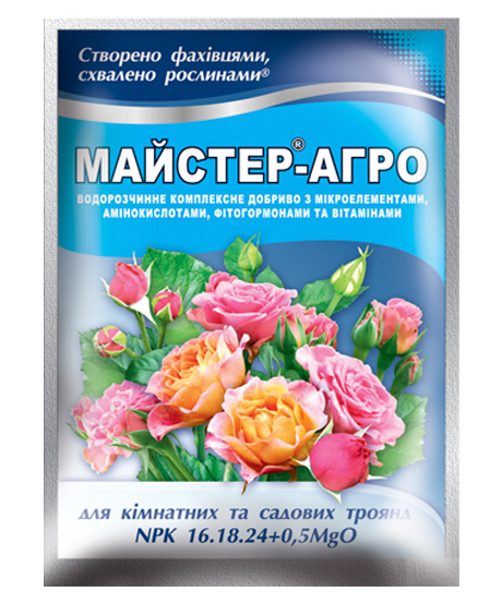 Майстер®-Агро – універсальне безхлорне, водорозчинне комплексне мінеральне добриво для підживлення всіх видів овочів, ягід, квітів і розсади. Збалансоване співвідношення макро- та мікроелементів задовольняє всі потреби рослин в елементах живлення на різних стадіях розвитку. Спеціально підібране поєднання амінокислот, фітогормонів та вітамінів стимулює утворення листя, цвітіння, забезпечує активне формування зав’язі, сприяє збільшенню врожайності, підвищує стійкість до захворювань, покращує приживлюваність розсади.
