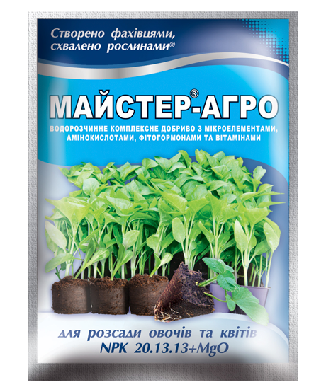 Майстер®-Агро – універсальне безхлорне, водорозчинне комплексне мінеральне добриво для підживлення всіх видів овочів, ягід, квітів і розсади. Збалансоване співвідношення макро- та мікроелементів задовольняє всі потреби рослин в елементах живлення на різних стадіях розвитку. Спеціально підібране поєднання амінокислот, фітогормонів та вітамінів стимулює утворення листя, цвітіння, забезпечує активне формування зав’язі, сприяє збільшенню врожайності, підвищує стійкість до захворювань, покращує приживлюваність розсади.