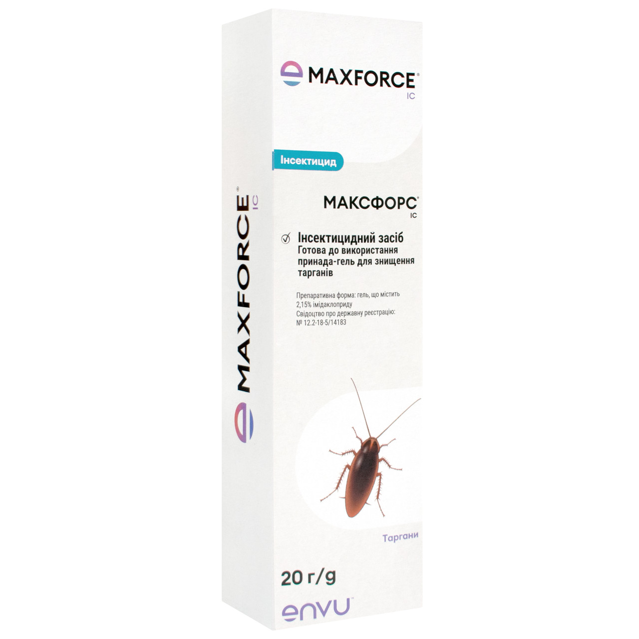 Інсектицид контактно-кишкової дії, виготовлений у вигляді гелю у пластиковому шприці-аплікаторі, призначений для дезінсекції житлових та виробничих приміщень, офісів, об’єктів громадського харчування, зоомагазинів, ветеринарних клінік з метою знищення синатропних тарганів. Склад гелевої приманки заснований на функціях діючого компонента – імідаклоприду (imidacloprid). Інсектицид проникає до організму комахи при контакті із зовнішніми покровами або з їжею. Імідаклоприд впливає на ацетилхолінові нейрорецептори комах, пригнічуючи передачу нервових імпульсів, внаслідок чого, загибель шкідників настає від паралічу протягом 24-48 годин. Тривала залишкова дія препарату Максфорс дозволяє інфікованим комахам поширити засіб по всій колонії, заражаючи інших сородичів.