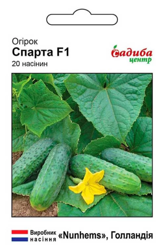 Огірок Спарта F1 – надранній гібрид огірка переважно жіночого типу цвітіння. Міцна відкрита рослина формує декілька зеленців на одному вузлі. Плоди однорідні, світло-зелені, білошипі, довжиною 6—12 см, циліндричні, співвідношення 3,1:1,0. Вирізняється високими смаковими якостями при свіжому вживанні: плоди соковиті, м’які, хрусткі з ніжною шкіркою. Дає рясний врожай на початку плодоношення і не знижує його на протязі всієї вегетації.