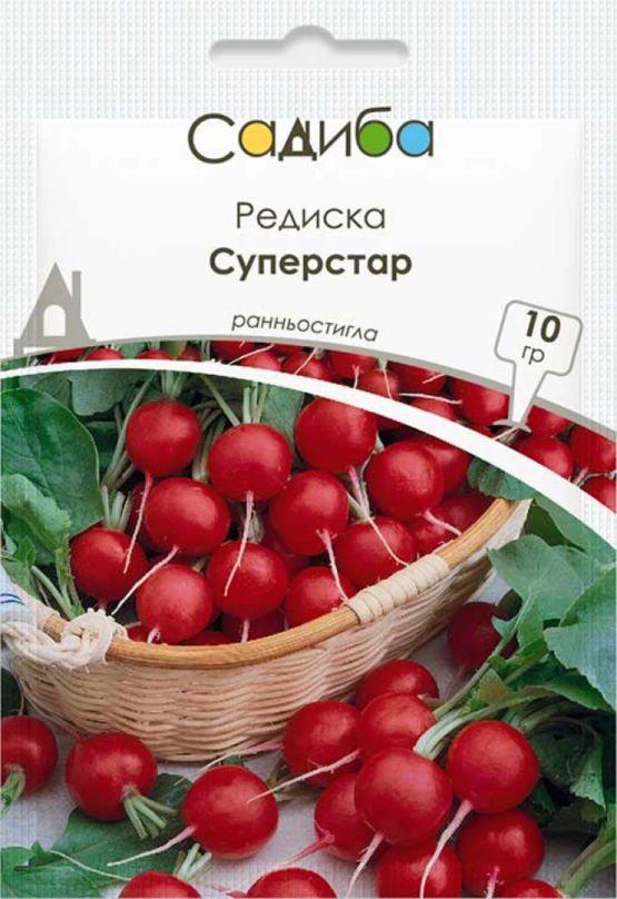 Редиска Суперстар – ранній (20-30 днів) високоврожайний (до 3 кг/м2) сорт всесезонного вирощування у закритому й відкритому ґрунті. Гичка невелика, плоди округлі насичено-червоного кольору вагою 30-40 г, білі всередині. М’якуш соковитий, хрумкий без гіркоти, помірно-гострого смаку. Коренеплоди збільшують масу впродовж вегетації, не трухлявіють, довго зберігають товарний вигляд. Сорт стійкий до стрілкування й розтріскування плоду. Гарний вибір для отримання врожаю ранньої продукції.