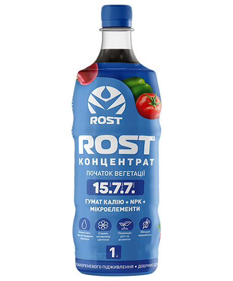 ROST® Концентрат – концентроване органо-мінеральне добриво на основі гумату калію, що містить комплекс макро- та мікроелементів. Добриво забезпечує рослини необхідними елементами живлення; мобілізує імунну систему рослин; покращує синтез цукрів, амінокислот, вітамінів в рослині; посилює поглинання води і кисню, що в результаті прискорює поділ клітин; інтенсифікує обмінні процеси; підвищує надходження поживних елементів в рослину; прискорює синтез нуклеїнових кислот і білка; активує білковий та вуглеводний обмін речовин; збільшує проникність клітинної мембрани; полегшує транспортування поживних речовин в середину клітини.