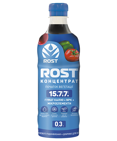 ROST® Концентрат – концентроване органо-мінеральне добриво на основі гумату калію, що містить комплекс макро- та мікроелементів. Добриво забезпечує рослини необхідними елементами живлення; мобілізує імунну систему рослин; покращує синтез цукрів, амінокислот, вітамінів в рослині; посилює поглинання води і кисню, що в результаті прискорює поділ клітин; інтенсифікує обмінні процеси; підвищує надходження поживних елементів в рослину; прискорює синтез нуклеїнових кислот і білка; активує білковий та вуглеводний обмін речовин; збільшує проникність клітинної мембрани; полегшує транспортування поживних речовин в середину клітини. Властивості: Призначення: для кореневого та позакореневого підживлення більшості сільськогосподарських культур в момент активного росту. Ефективність: стимулює ріст та розвиток рослин, посилює поглинання елементів живлення з ґрунту, активізує обмінні реакції, пришвидшує транспортування елементів живлення та сполук в рослині, активує нарощування вегетативної маси рослин.