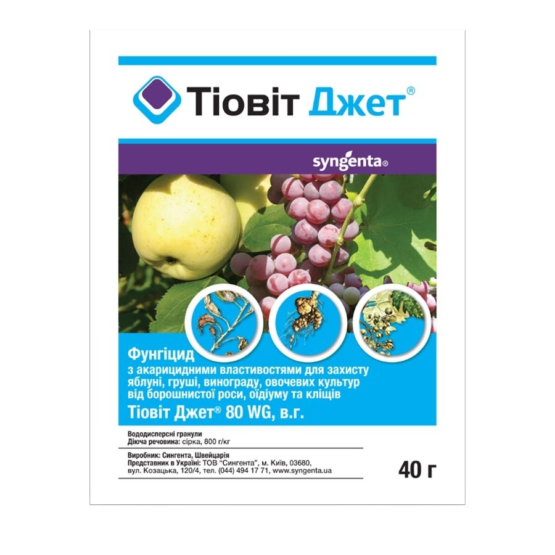 Фунгіцид Тіовіт Джет з акарицидними властивостями компанії Syngenta застосовується для обробки овочевих та плодових культур від комплексу грибкових та бактеріальних захворювань та для знищення рослиноїдних кліщів.