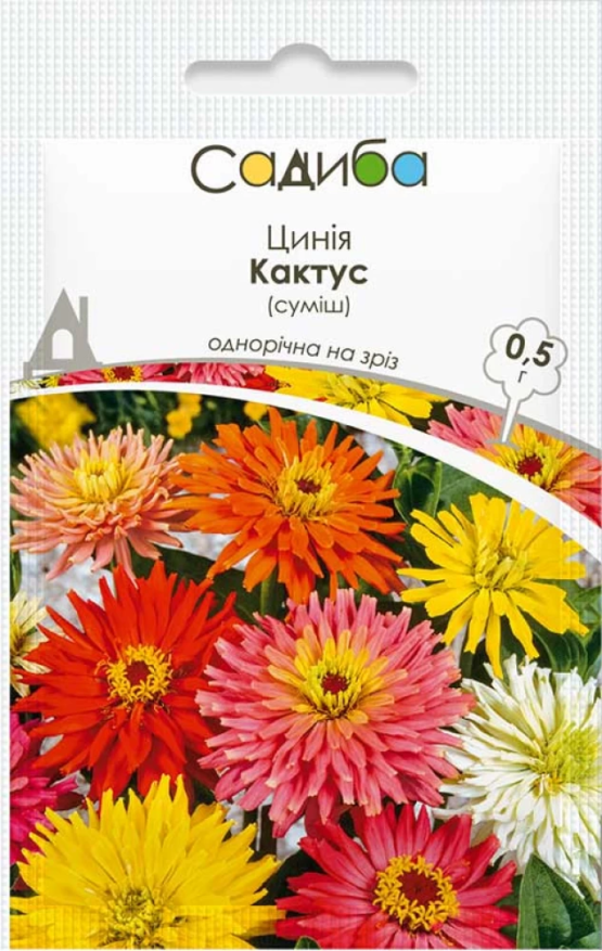 Цинія Кактус суміш – однорічна квітка, відома як майорці. Формує сильні високі прямостоячі стебла заввишки 90 см, які майже не галузяться, й великі наповнені махрові та напівмахрові квіти з вузькими гофрованими пелюстками, діаметром 8-10 см, яскравих відтінків білого, жовтого, помаранчевого, лілового, рожевого й червоного. Зацвітає через 2,5 місяці після посадки й осяює подвір’я весь сезон до осені. Яскраво виглядає в квітниках і бордюрах у групових посадках.