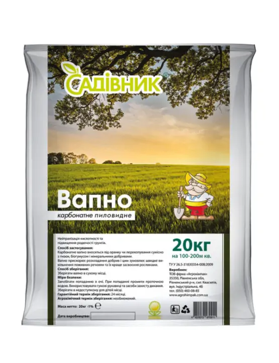 Спосіб застосування: Карбонатне вапно вноситься під оранку чи перекопування сумісно з гноєм, біогумусом і мінеральними добривами.